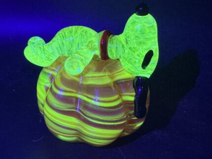 Cast Uranium Glass Sugar Skull was made using a bronze pop out mold technique. This piece was newly produced in the past 5 years. The glass used was scrap Burmese slag uranium glass. Sugar skulls are sold with stand. The item is approximately 6” tall and 3/4” thick! Art was made in a family owned and operated glass studio, Sigma Glass Studio.